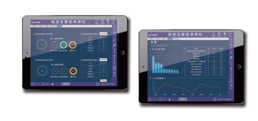 对设备上料区、焊接区、下料区进行动态监测,用户可以实时查看到设备A\B两侧关键部件的状态、温度情况。系统采用RS458通信方式,与温控模块电流板变频器进行通讯。数据统计功能主要对设备的产能、产量、综合效率、报警故障进行统计分析,以丰富清晰的图表进行可视化展示。有助于快速了解设备产能情况、故障情况,快速决策及维护 。